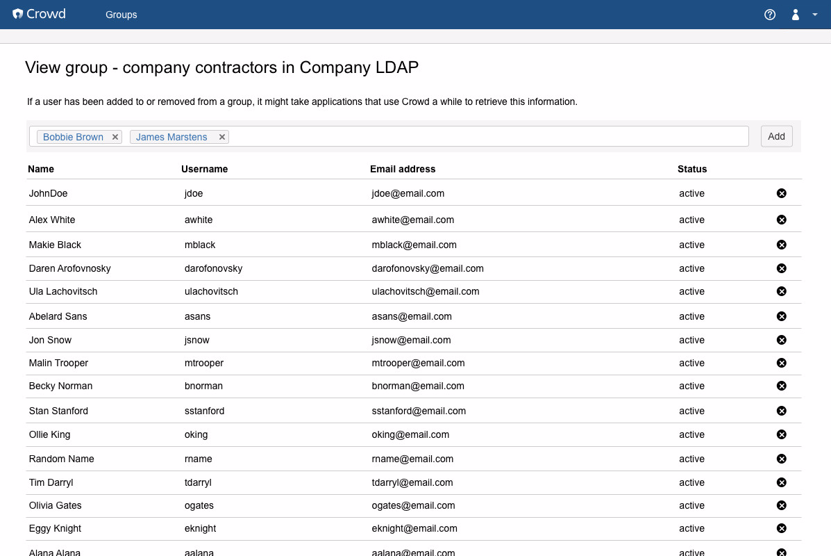 Starting from version 3.3, Crowd Data Center allows administrators to delegate some of their responsibilities over groups with Group Level Admins. Group Level Admins have rights to manage members of the groups they were allowed to administer. This also include groups and their members that are not in the same directories as Group Level Admins.
