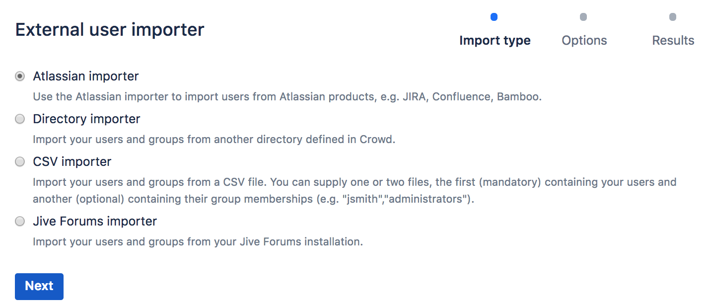 - Atlassian Importer — see Importing Users from Atlassian Confluence, Importing Users from Atlassian Jira and Importing Users from Atlassian Bamboo