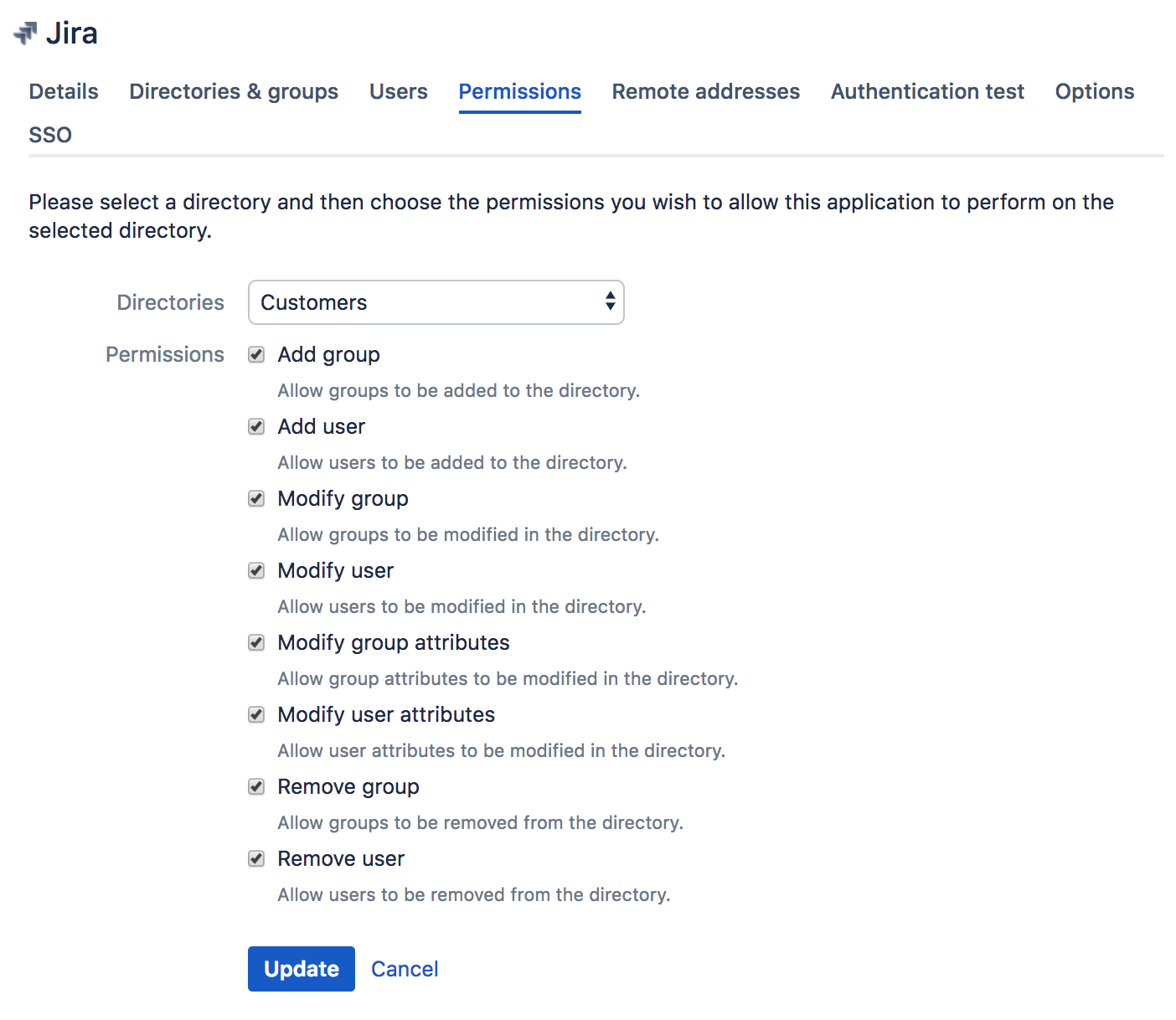 - Application-level directory permissions are defined on the 'Permissions' tab of the 'View Application' screen. If a permission is enabled at directory level, you can enable it for a specific application. For example, you could enable the 'Add User' permission on the 'Customers' directory in Jira but disable the permission for Confluence.