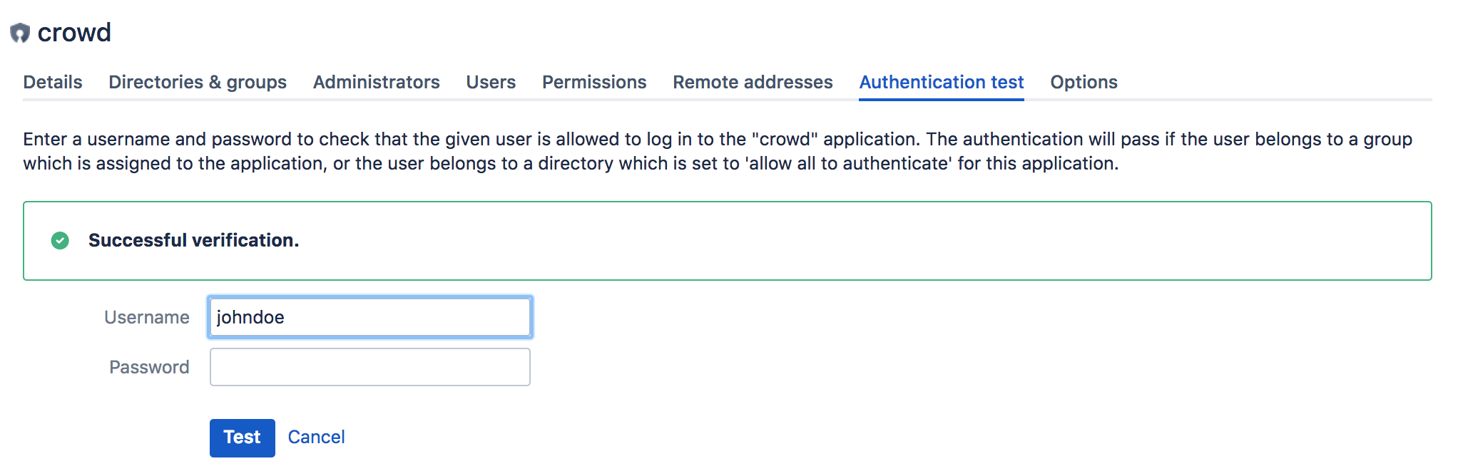 If this test is successful, but the user is having trouble authenticating to an application, then the problem is caused by the connection between the application and Crowd rather than by user authentication.