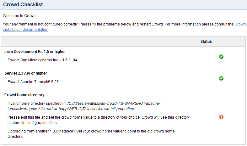 This page describes the 'Crowd Checklist' screen and tells you how to use the screen to troubleshoot your initial Crowd configuration. The 'Crowd Checklist' screen may appear when you start the Setup Wizard after installing Crowd.