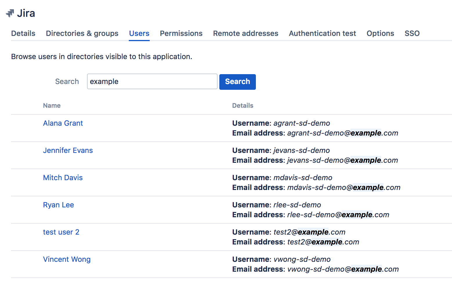 The application 'Users' tab shows all the users in all the directories mapped to the selected application. You will also see basic information for each user, including the user's full name, username and email address. If the user has an alias for the selected application, the alias will appear too.