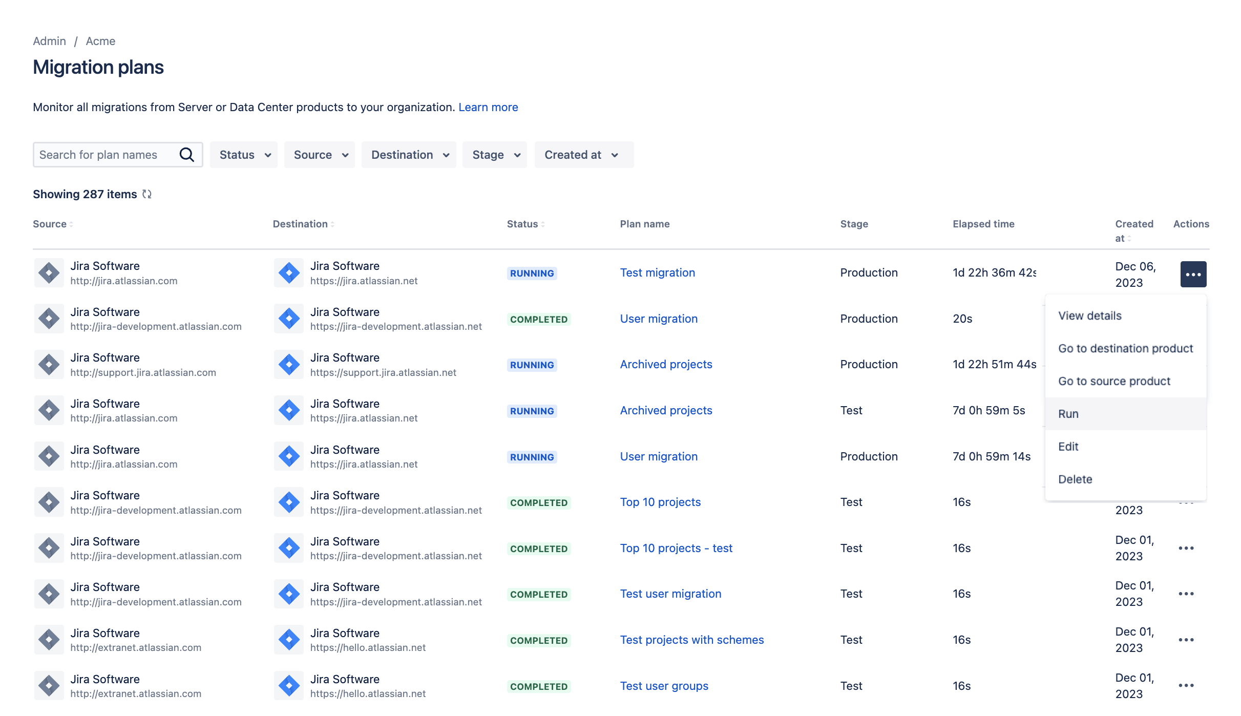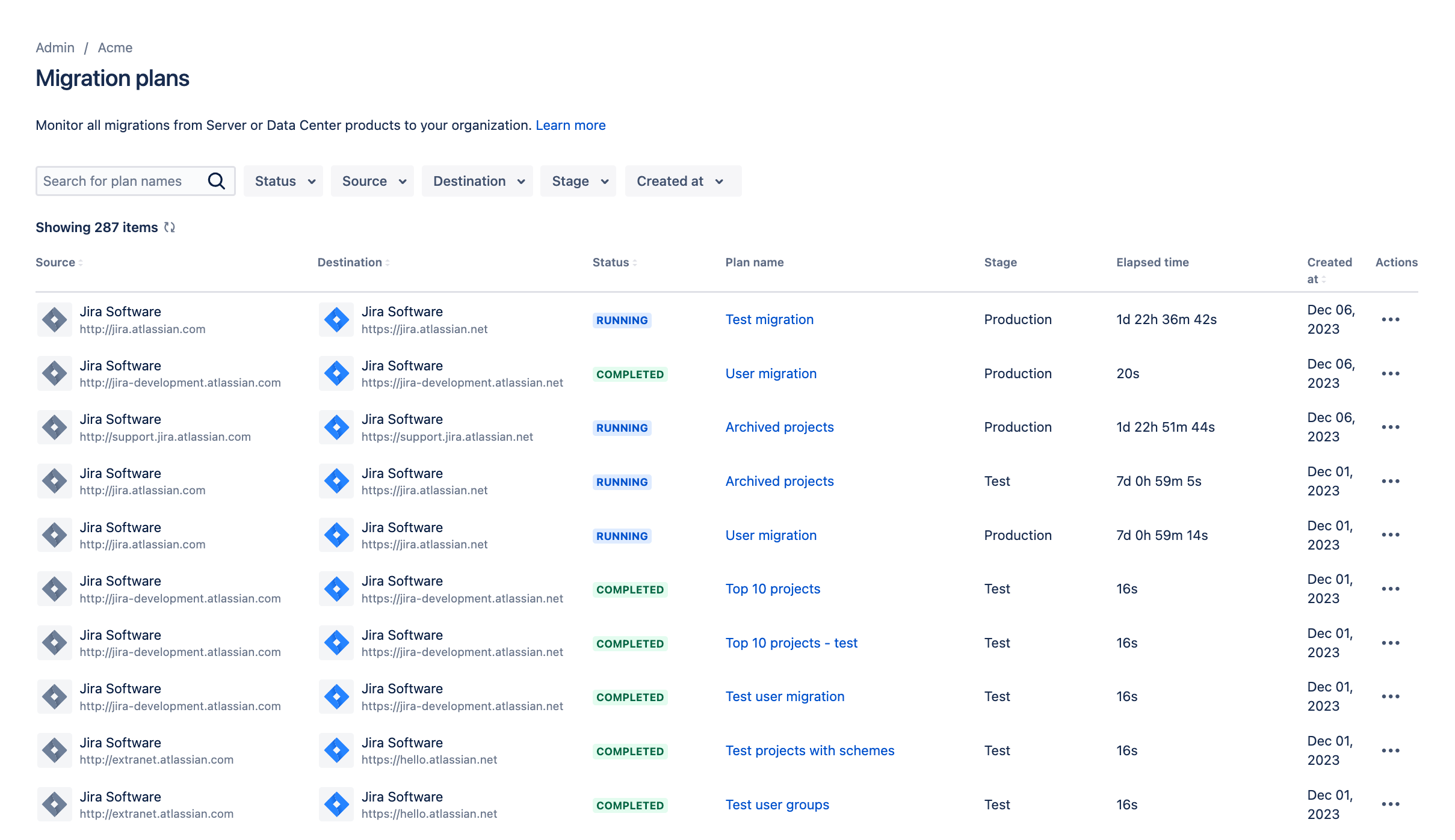 移行計画のダッシュボードには、組織内の製品を対象とするすべての Server 移行または Data Center 移行のグローバル ビューが表示されます。Jira と Confluence の移行アシスタントを切り替えることなく、各移行計画の移行元インスタンス、移行先、詳細を簡単にモニタリングできます。