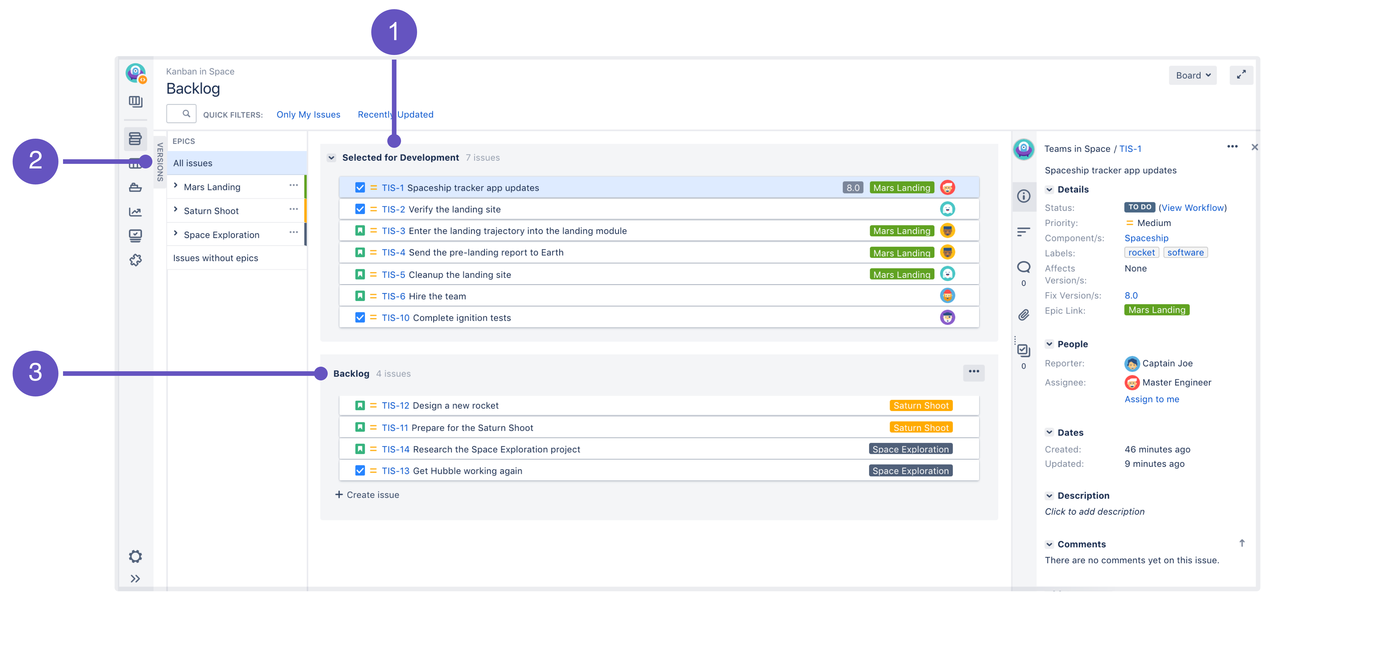 - バージョン(非表示)およびエピック(展開済み)パネル。バージョンまたはエピックを選択し、関連する課題を表示したり、課題をドラッグして関連付けます。
