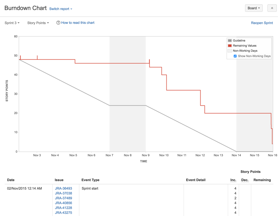 - 灰色のガイドラインの線が表示されない場合、このナレッジベース記事の説明にあるように、スプリントに何らかの課題が割り当てられる前にスプリントが開始された可能性があります。