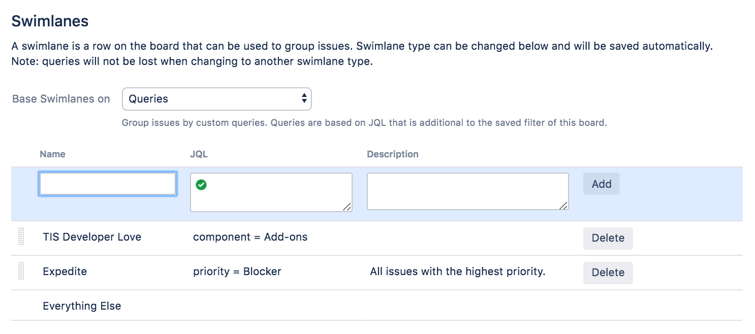 スイムレーンが (ストーリーや担当者ではなく) JQL クエリに基づいている場合、次の手順で JQL クエリを作成、削除、および変更できます。