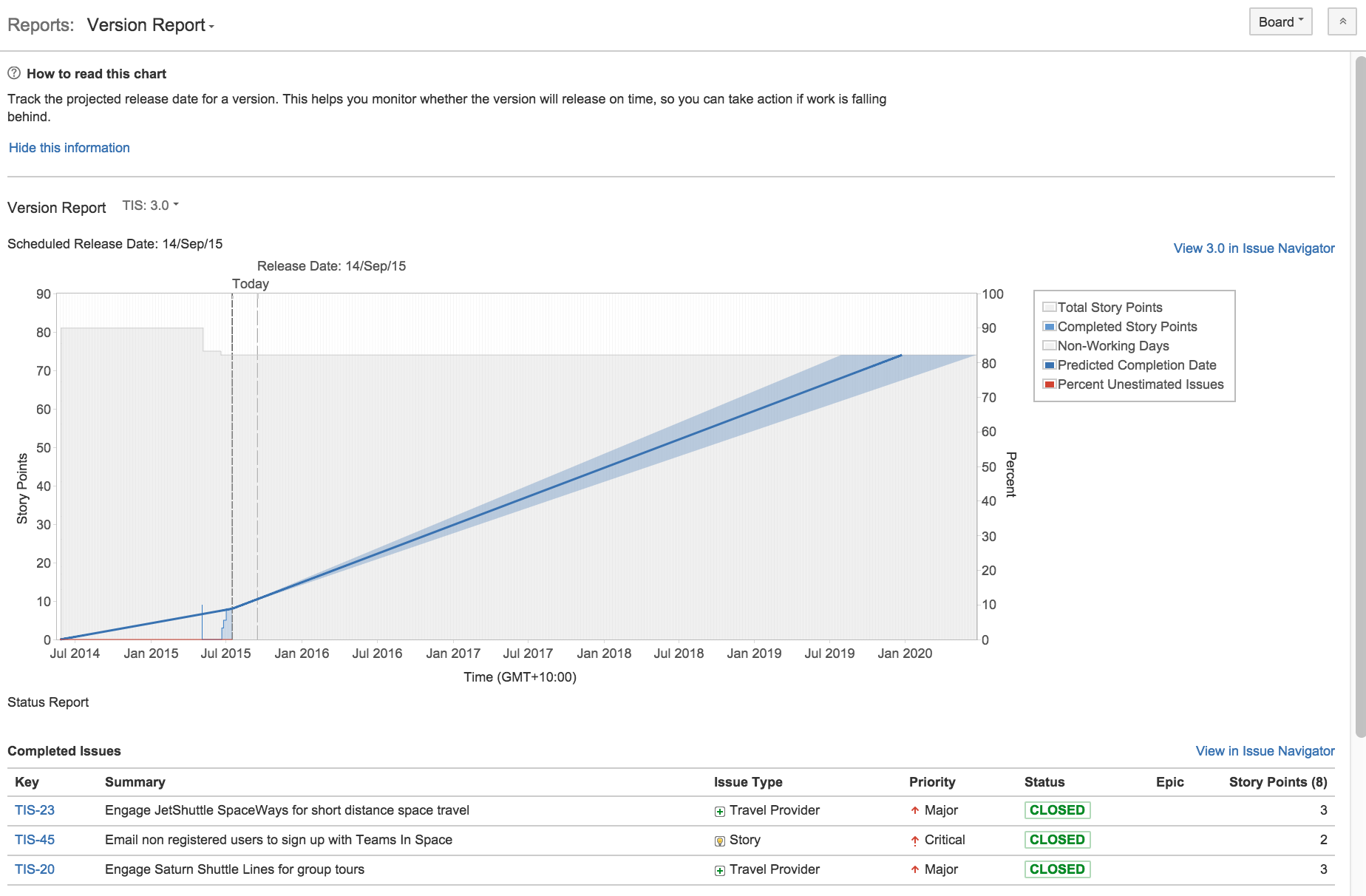- 予測リリース日 (青い線) - このバージョンが完了すると見込まれる日です。ベロシティと見積もられた残タスクから算出されます。