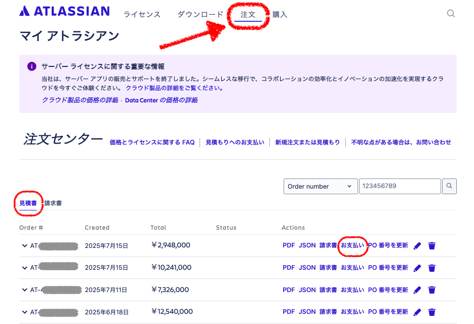 - 銀行振込時のリファレンス(備考)に、アトラシアンが発行した注文リファレンス番号(見積書番号) AT-XXXXX (数字) を必ず入力してください。