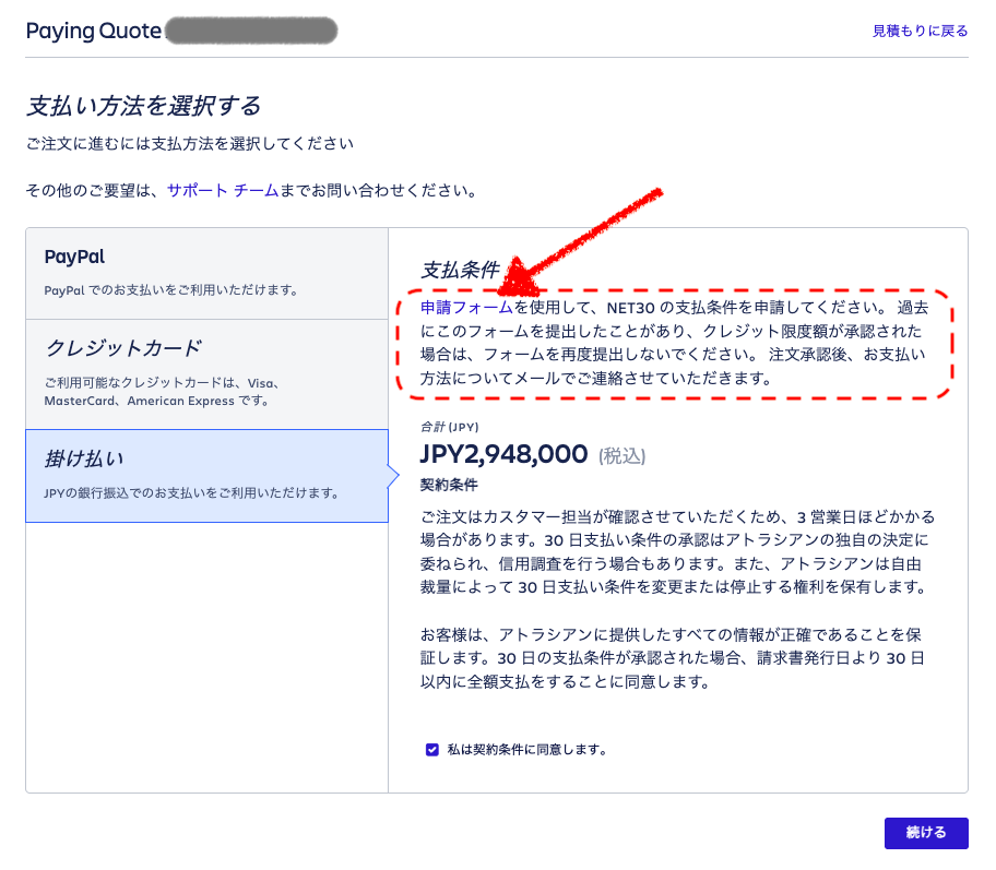 "掛け払い(Pay on terms)" の箇所をクリックします。