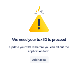 申請フォームに進み、こちらのメッセージが表示された場合、請求先情報の登録ページより、納税者番号の入力をしてください。