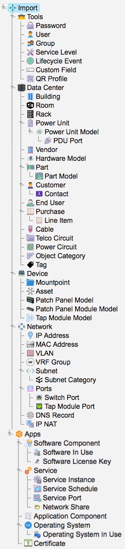 The data collected from Device42 is assembled and imported into Assets. The Object Schema Tree looks like this in Assets: