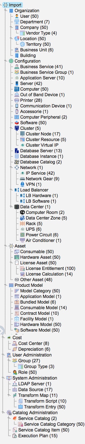 The data collected from ServiceNow is assembled and imported into Assets. The Object Schema Tree looks like this in Assets:
