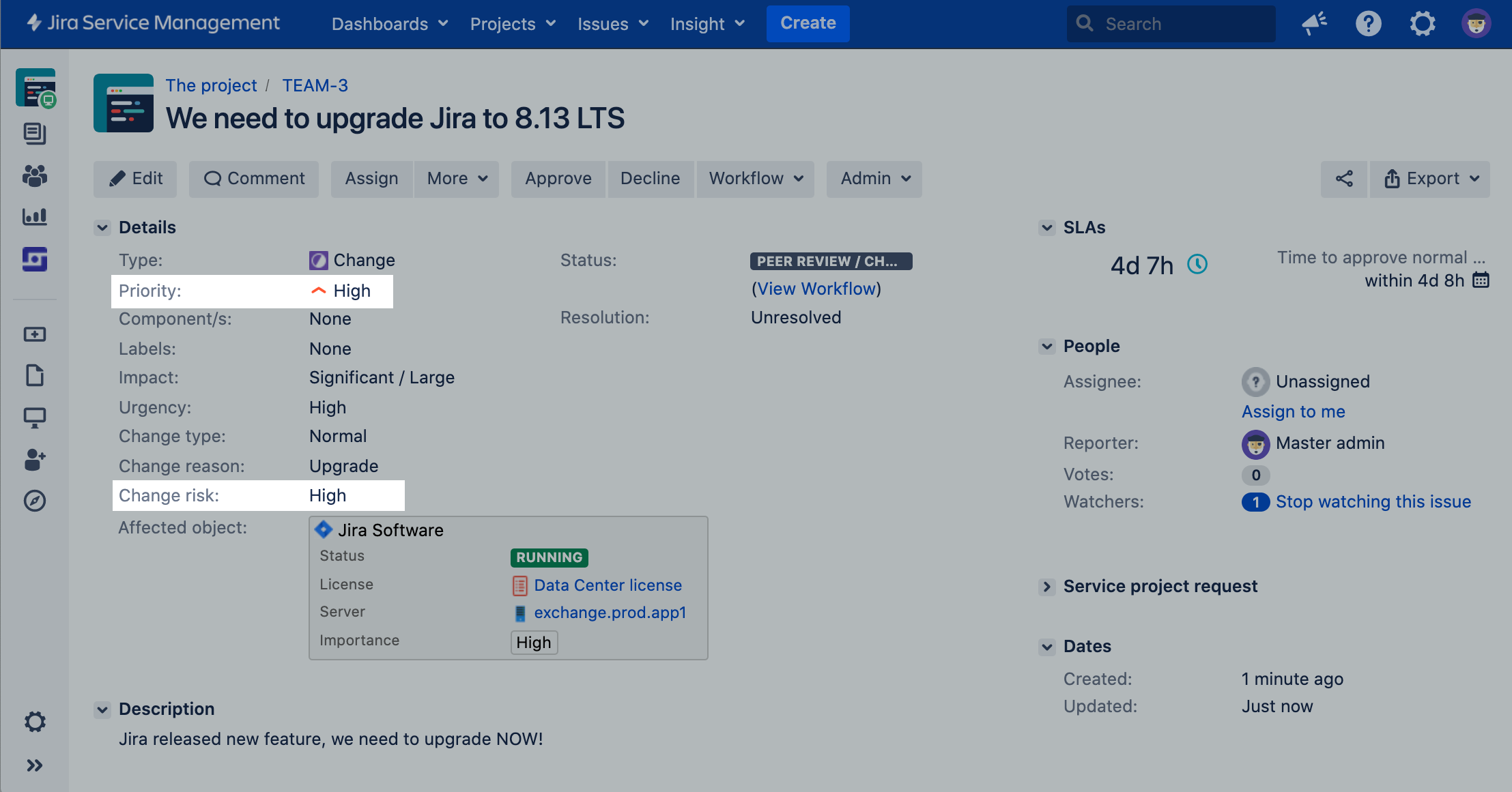 これは、承認者が変更を承認する際に必要な手順を踏むのに役立ちます。たとえば、日付を週末に移動して、この Jira インスタンスを使用するチームがスムーズに作業できるようにします。 | |