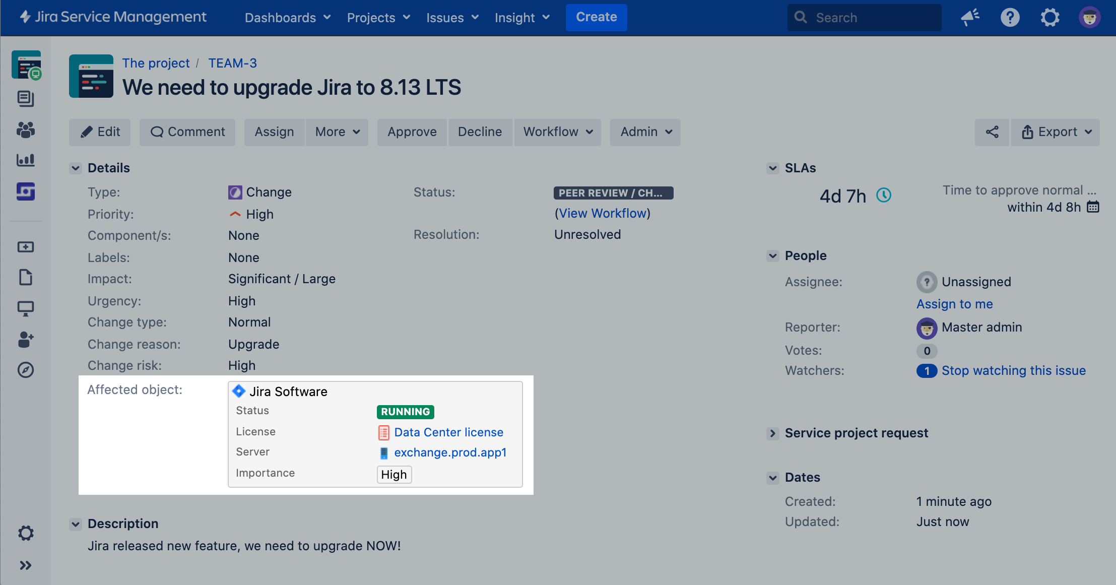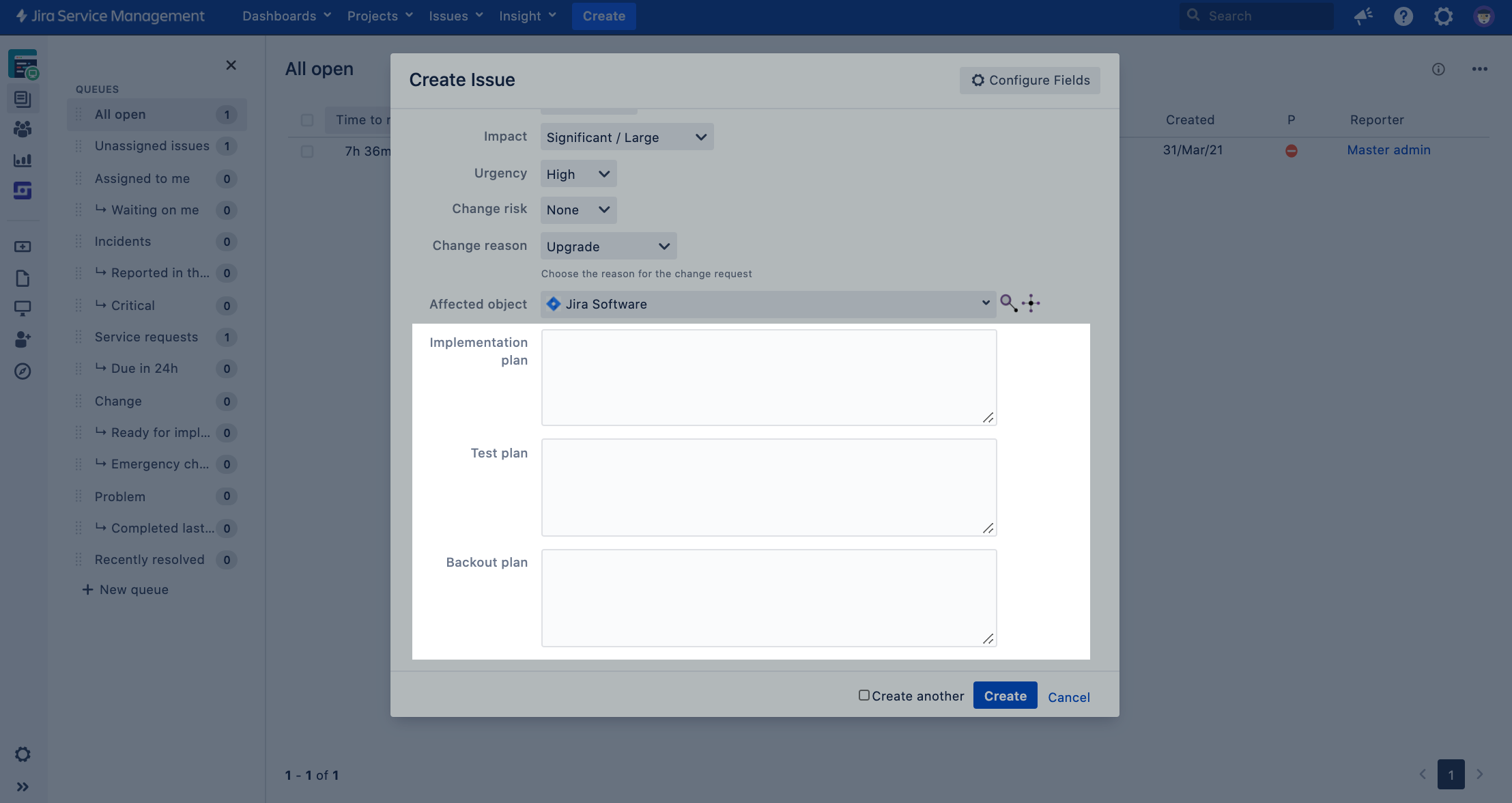 変更リクエストの作成 変更リクエストを開いて、この Jira インスタンスを影響を受けるオブジェクトとして選択します。 | |