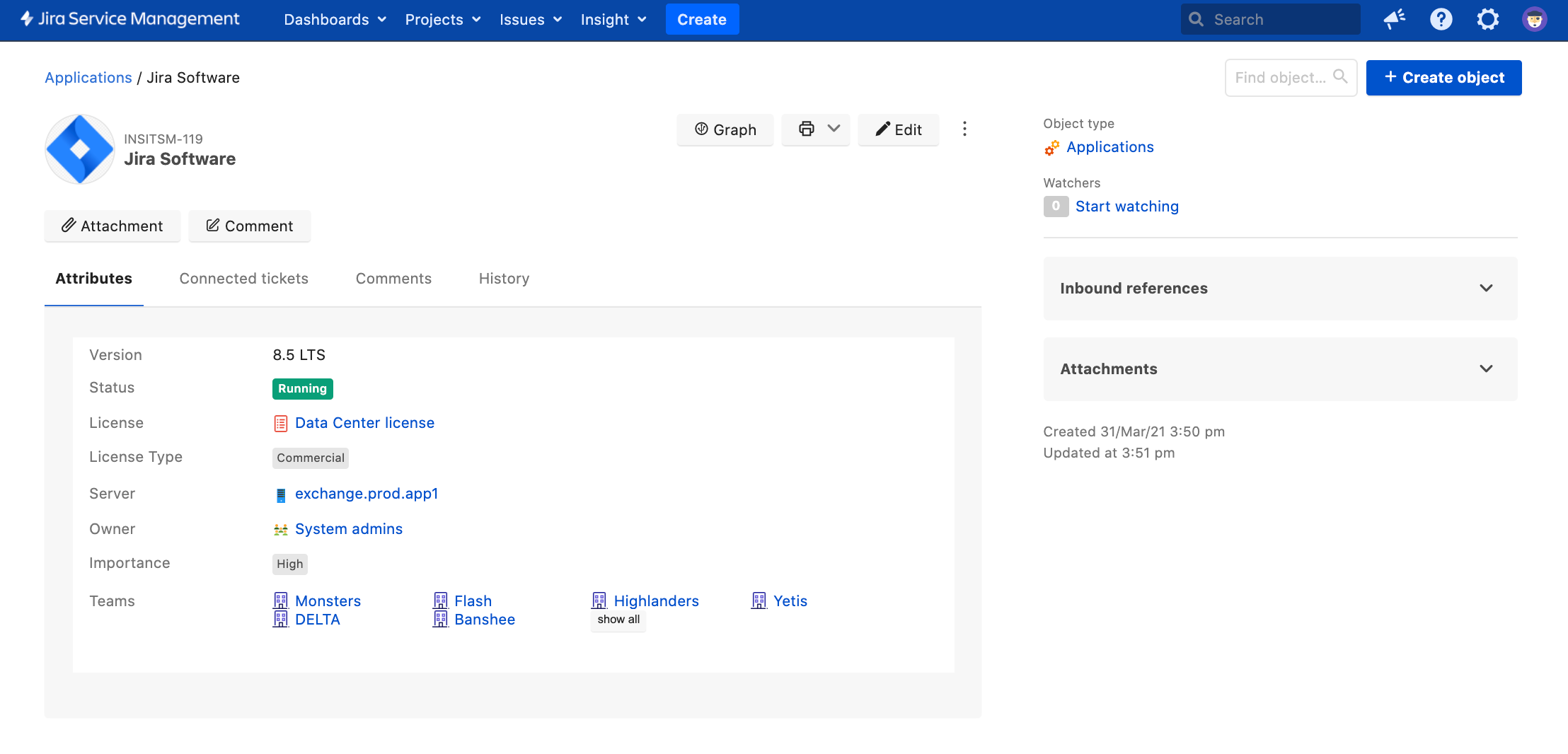 アセット機能におけるアセットの表示 アセット機能で対象の Jira インスタンス (アセット) を見てみましょう。これはかなり古いバージョンなので、新機能、セキュリティ アップデート、その他のすべてのバグ修正を入手するためにアップグレードしたいと考えています。 最新の LTS リリース 8.13 にアップグレードするための変更リクエストを開きます。 | |