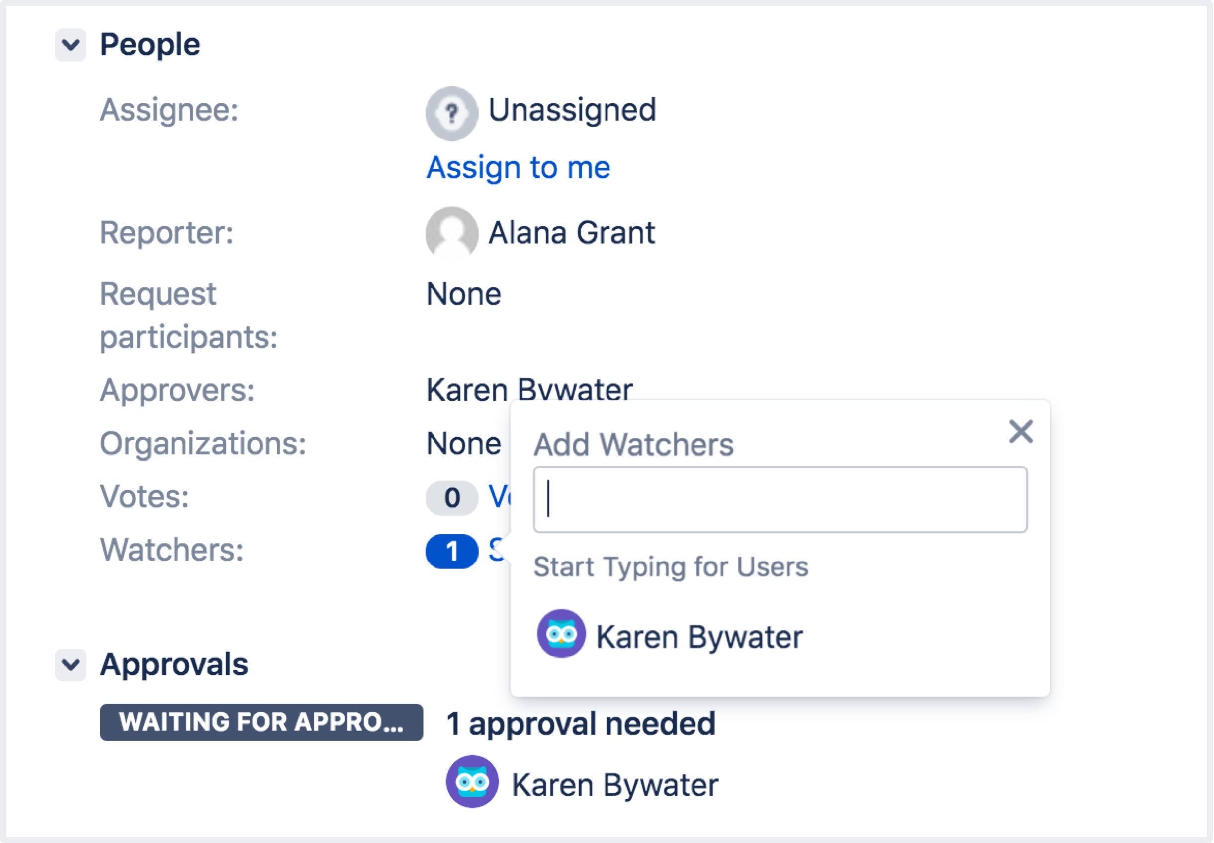 - 数を選択して、名前またはメール アドレスを [ウォッチャーを追加] フィールドに入力します。フィールドのユーザー ピッカーには、課題が属するプロジェクトへのアクセス権を持つユーザーのみが一覧表示されます。