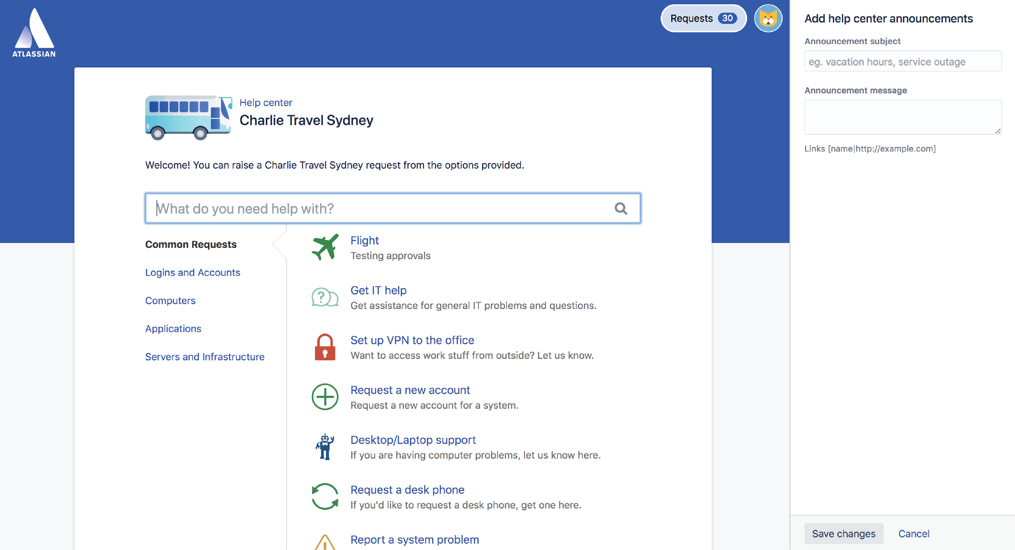 ヘルプ センターは、すべてのサービス プロジェクト (カスタマー ポータル) をコレクションです。顧客はヘルプ センターにアクセスすることで、自身がリクエストの送信権限を持つすべてのサービス プロジェクトを確認できます。お知らせをここに追加するには、次の手順に従います。