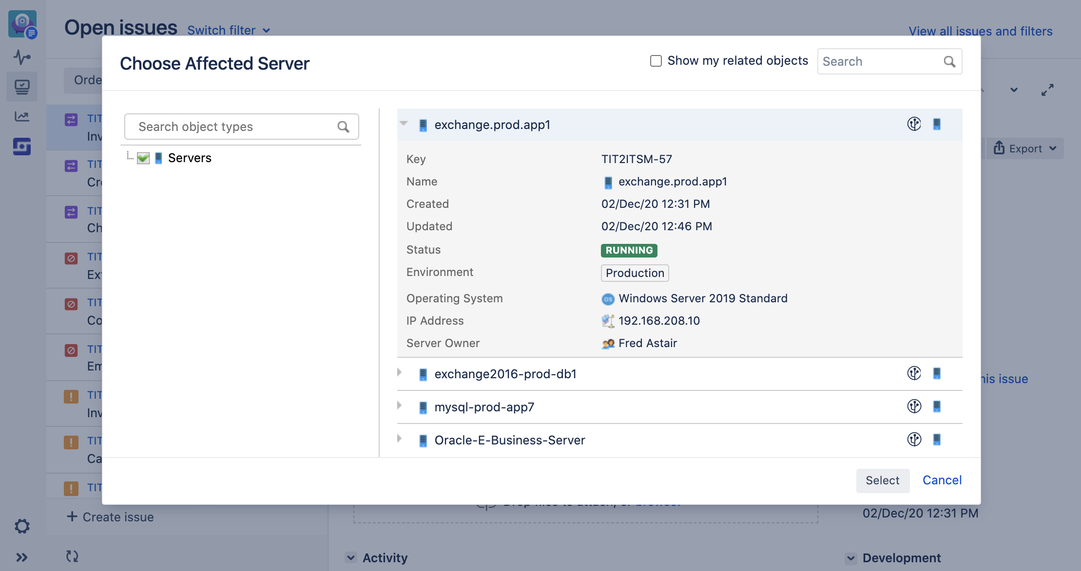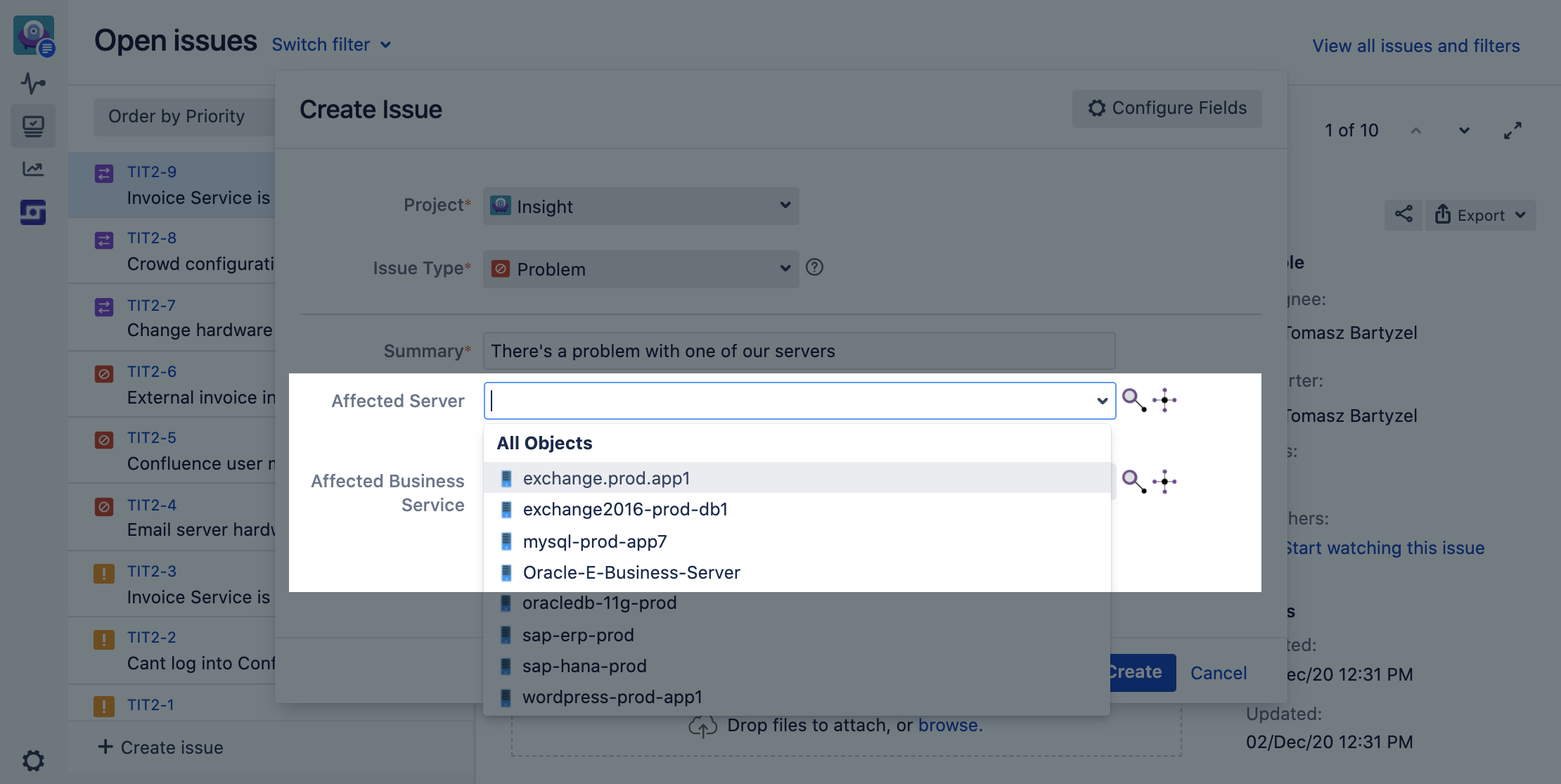 - Jira の課題を作成または編集して、アセット カスタム フィールドを探します。これは、他のフィールドと同じように見えます。下の例では "影響を受けるサーバー" がカスタム フィールドです。