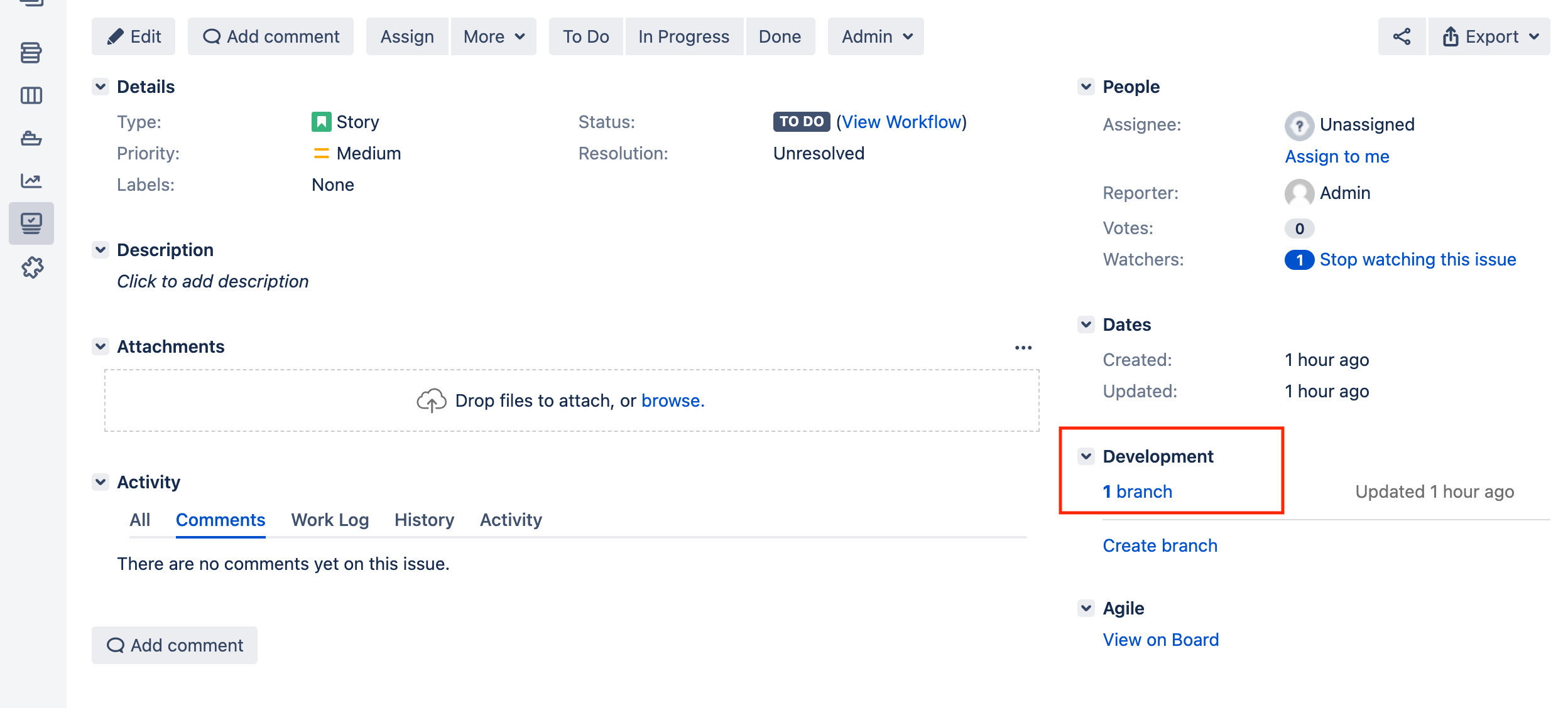 OpenTelemetry Agent を使用すると、Jira のすべてのリクエストだけでなく、製品全体のリクエストを追跡できます。次のスクリーンショットは、Jira 課題ビューでの開発ツールを示しています。このビューは、Jira と Bitbucket 間に Applink がある場合にのみ表示されます。リンクをクリックすると、設定した Bitbucket インスタンスに対して Applink リクエストが行われ、ブランチとそのリポジトリに関するデータが取得されます。
