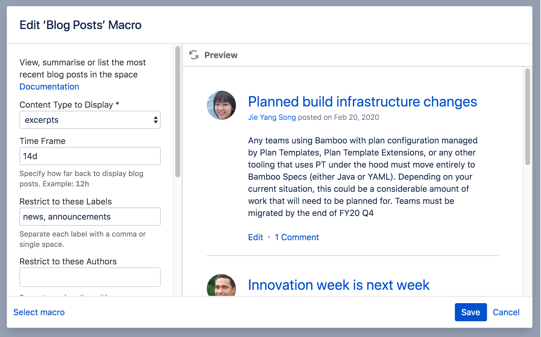 Confluence でのブログの全般的な情報については、「ブログ投稿」をご覧ください。