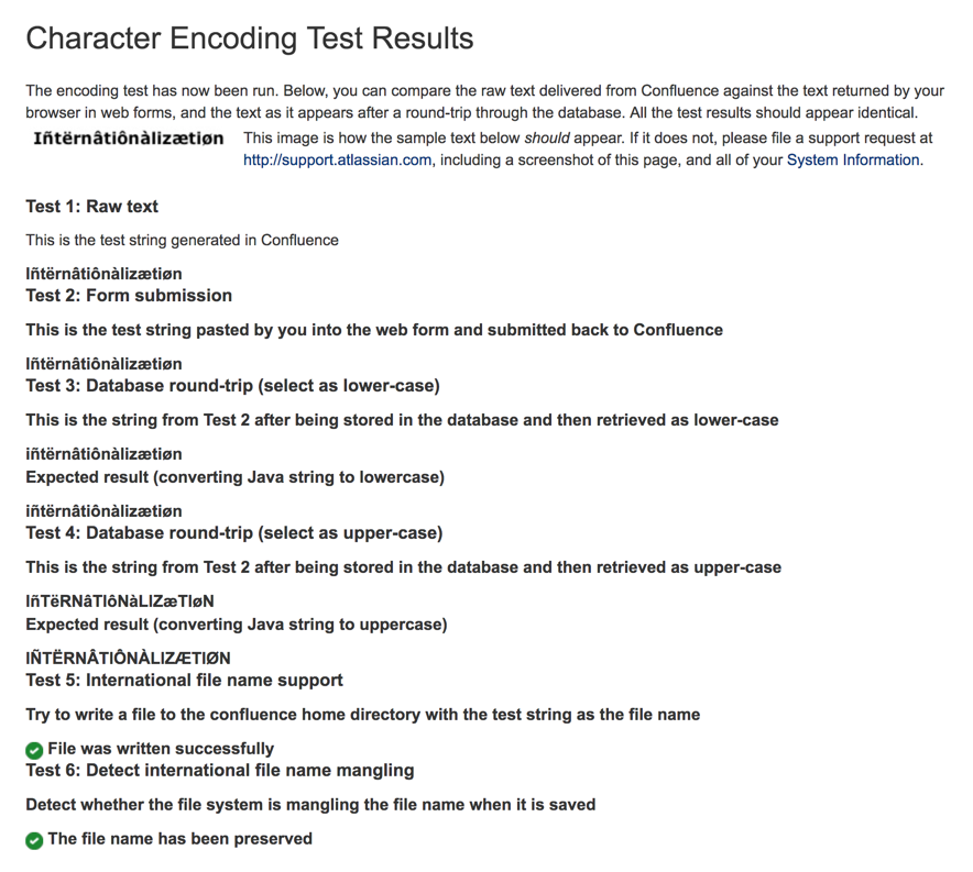 Confluence には、設定の問題を解明できるエンコーディング テストが含まれています。これを実行するには Confluence 管理者である必要があります。