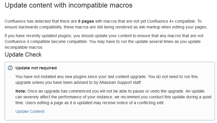 注意:プロセスが破壊的ではないとはいえ、いかなるConfluence アップグレードにおいても推奨するように、新しいバージョンの Confluence を起動させる前にデータベースとホームディレクトリのバックアップを確実に行う必要があります。