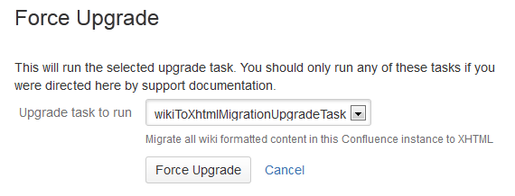 2. 実行するアップグレード タスクのドロップダウンリストからwikiToXhtmlMigrationUpgradeTaskを選択します。