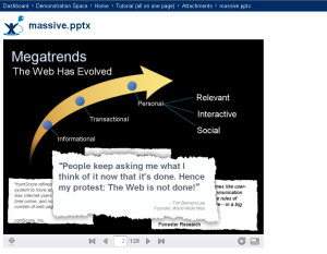 Confluence で PowerPoint 2007 ファイルを直接プレビューできるようになりました。これで、Confluence の 3 つの主要な Microsoft Office 製品 (Word、Excel、PowerPoint) のための新しい 2007 ファイル フォーマットを Confluence 3.1 でサポートするという目標を完全に達成できました。これは、従来のバイナリ形式のサポートに追加されるものです。