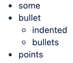 番号なし箇条書きを作成するにはアスタリスク (*) を使用します。各下位レベルで1つアスタリスクを追加します。