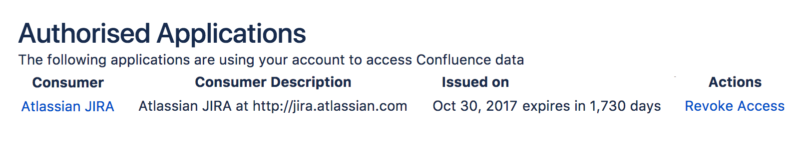 発行日 | Confluence により OAuth アクセス トークンがコンシューマーに発行された日付。このガジェットから Confluence ユーザー アカウントに限定された Confluence データへのアクセスを承認すると、即座に発行されます。 |