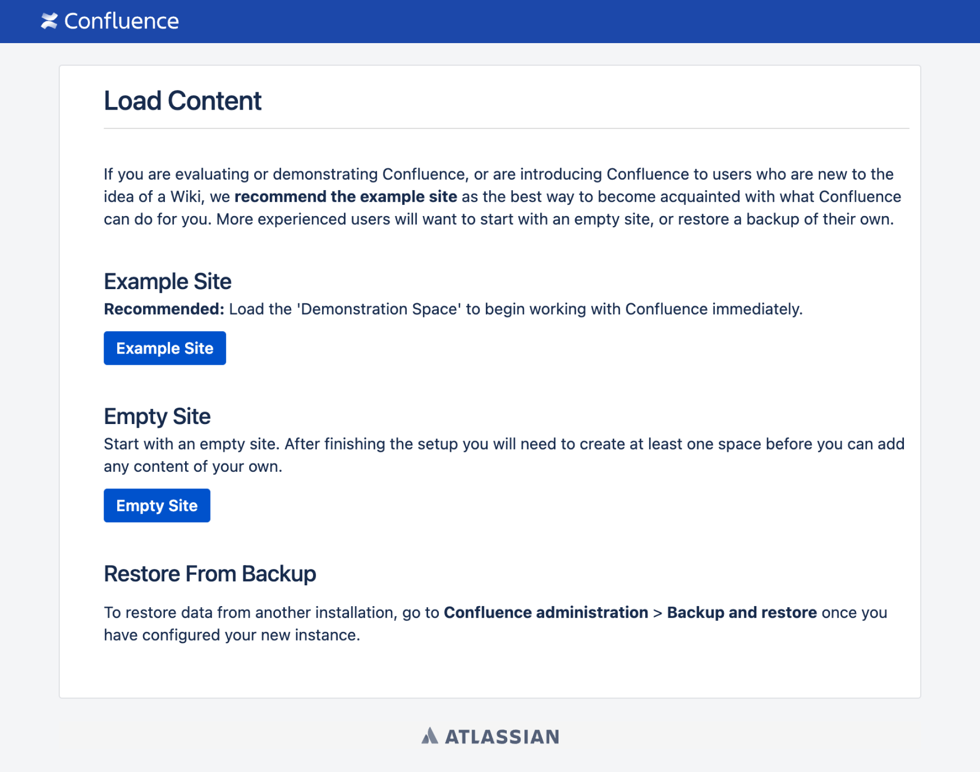 ユーザーのウェブブラウザーから Confluence に初めてアクセスすると、Confluence セットアップウィザードが開始されます。これは、ユーザーサイトの Confluence に必要な設定を行うための一連の画面です。また、以前にインストールした Confluence からのデータの取得や復元を簡便に行う手段も提供します。また、以前にインストールした Confluence からのデータの取得や復元を簡便に行う手段も提供します。