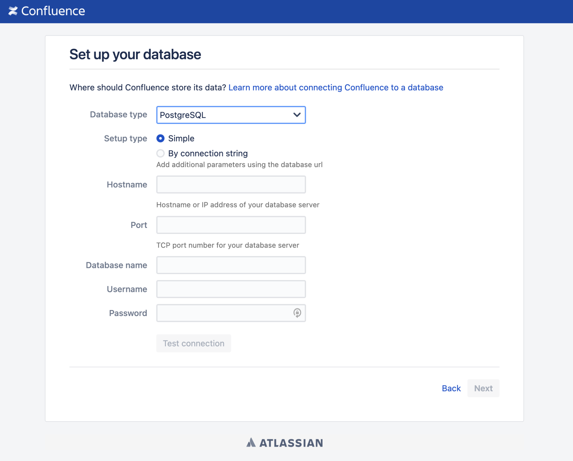 • 接続先データベースの種類。これによって Confluence が使用する言語を指定します。