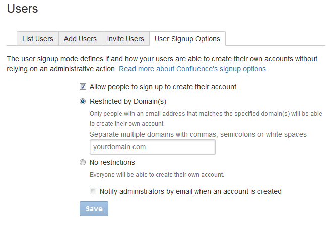 - ドメインで制限する – 注意: ドメインを制限したサインアップを行うには、Confluence でメール サーバをセットアップする必要があります。このオプションを選択すると、テキスト ボックスが表示されます。1 つまたは複数のドメインをコンマ区切りで入力します。ユーザーは、自身のメール アドレスがここで指定したドメインのいずれかに属している場合にのみサインアップできるようになります。Confluenceは、メール アドレスを確認するためのリンクのメールをユーザーに送信します。
