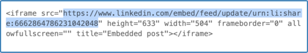 または、[コードをコピー] をクリックします。エディタにコードを貼り付けると、Confluence がリンクを自動変換してマクロを挿入します。追加の iframe タグはエディタで削除する必要があります。削除しないと、LinkedIn 投稿と一緒に表示されます。