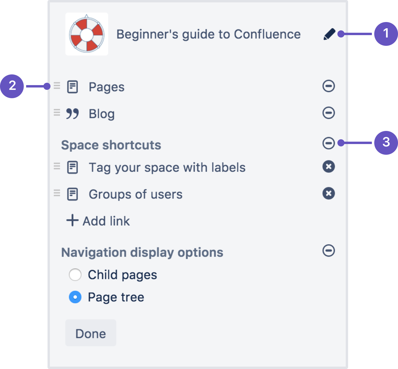スペースの管理者 であれば、 スペースの名前、ロゴ、またはページ階層の表示方法を変更するなど、スペースのサイドバーに変更を加えられます。また、サイドバーにショートカットリンクを追加して、利用者が重要なコンテンツにすぐに移動できるようにすることが可能です。