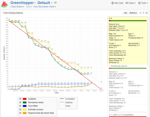 The GreenHopper Chart Board provides you with a graphical representation of the progress of ongoing versions. You can view 'burndown' graphs that show the number of incomplete issues that need to be addressed or hours remaining to complete work for a specified version, over the duration of that version. You can also view 'burnup' graphs to show other custom data associated with issues, such as business value.