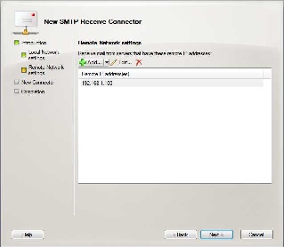 Open up the Exchange MMC and select Hub Transport under Server Configuration on the left side. Split into two horizontal windows, it makes it easier to see a list of configured servers with the Hub Transport role at the top, and Receive Connectors at the bottom. Select whichever Hub Transport server is needed want this relay for and select the "New Receive Connector" in the action area on the right of the MMC. This should open the "New SMTP Receive Connector" wizard.