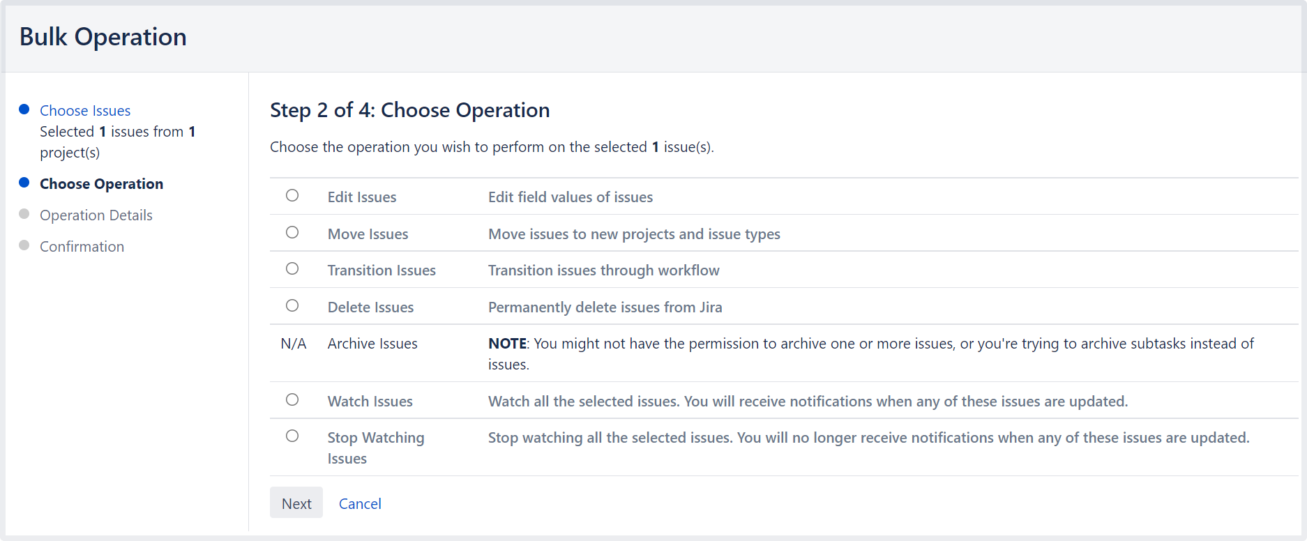 一括変更の操作を実行するには、プロジェクト固有の適切な権限とグローバル一括変更の権限が必要です。たとえば、一括移動の操作を実行するには、課題の移動と一括変更の両権限が必要です。一括変更の機能にアクセスできない場合は、プロジェクト管理者に必要な権限を付与するように依頼してください。