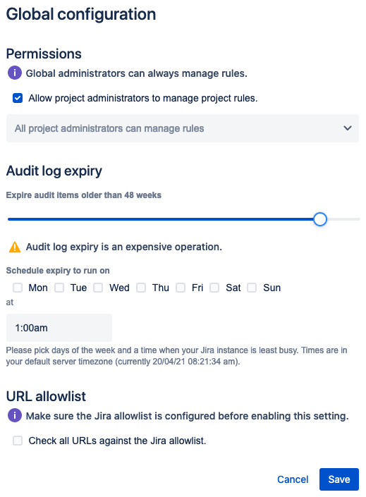 Automation for Jira 3.12 以降の実行時に、グローバル管理者が監査ログの有効期限を設定できるようになりました。[グローバル設定] セクションに進んで監査ログの有効期限を希望の値にスライドさせ、監査ログの有効期限を有効にします。