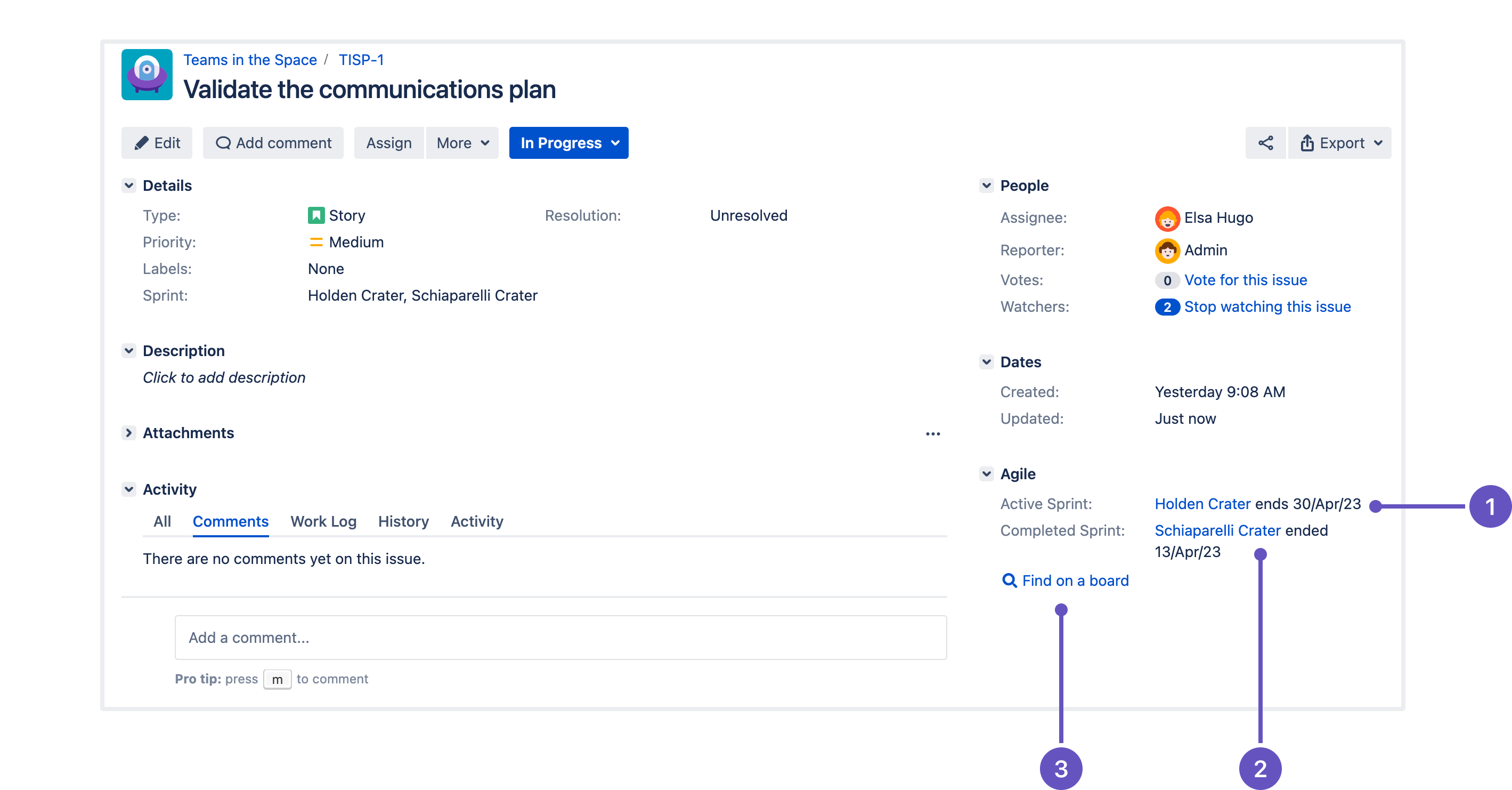 アジャイル パネルには、現在表示中の課題に関する追加のアジャイル情報が表示され、課題が属するプロジェクトのタイプに応じて、表示されている課題または課題が属するスプリントが表示されたボードを検索できます。