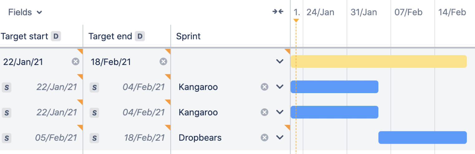 外部スプリントが作成されないようにするために、できる限りボードを課題ソースとして使用することをお勧めします。1 つのボードは 1 つのスプリントのみをカバーするためです。プロジェクトやフィルターからインポートされた課題は、複数のスプリントの割り当てを含む場合があります。その場合は、タイムライン上で外部スプリントとして表示されます。