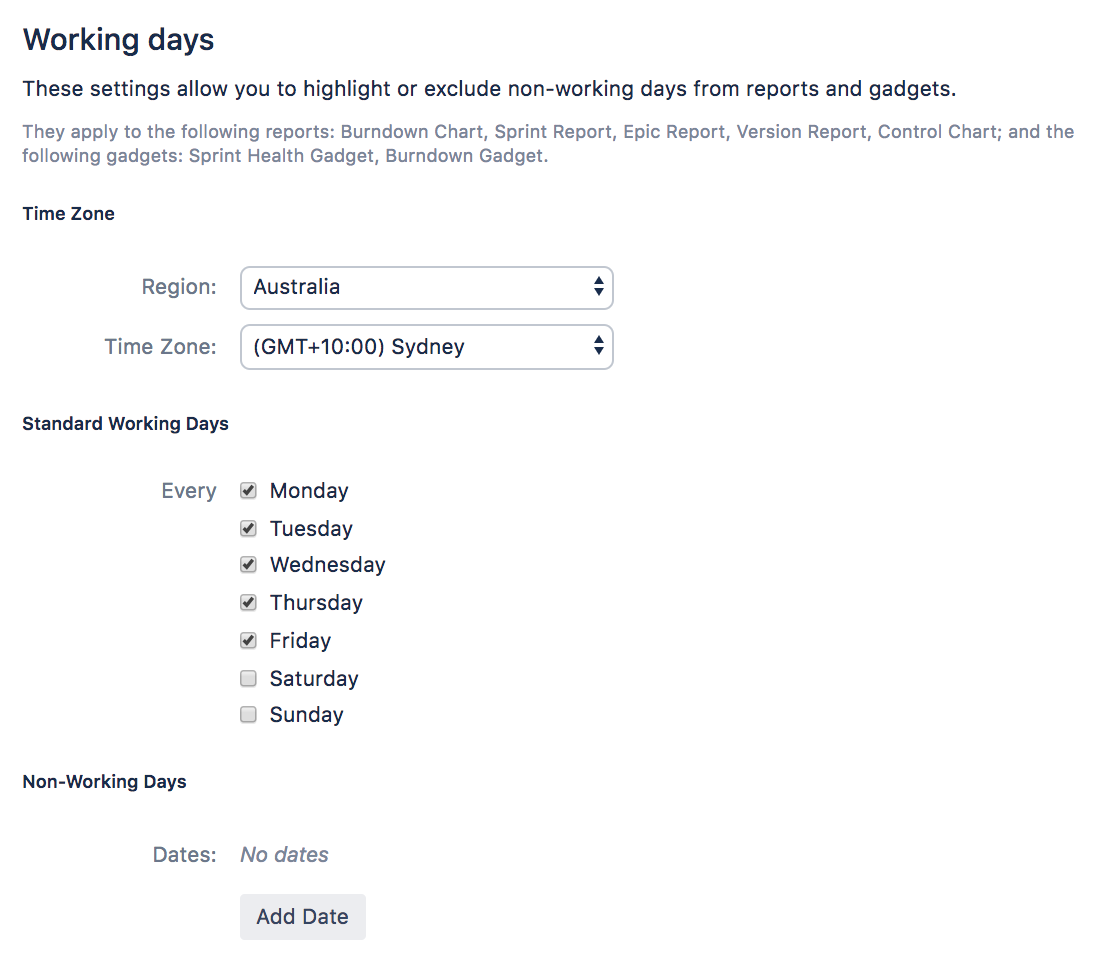 - 作業日が影響を与えるチャートについてさらに詳しく:バージョンレポート、コントロールチャート、バーンダウンチャート、スプリントレポート、エピックレポート
