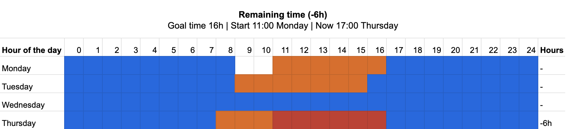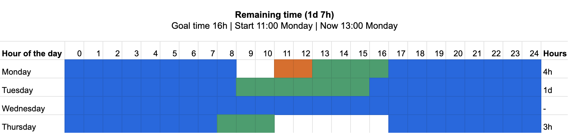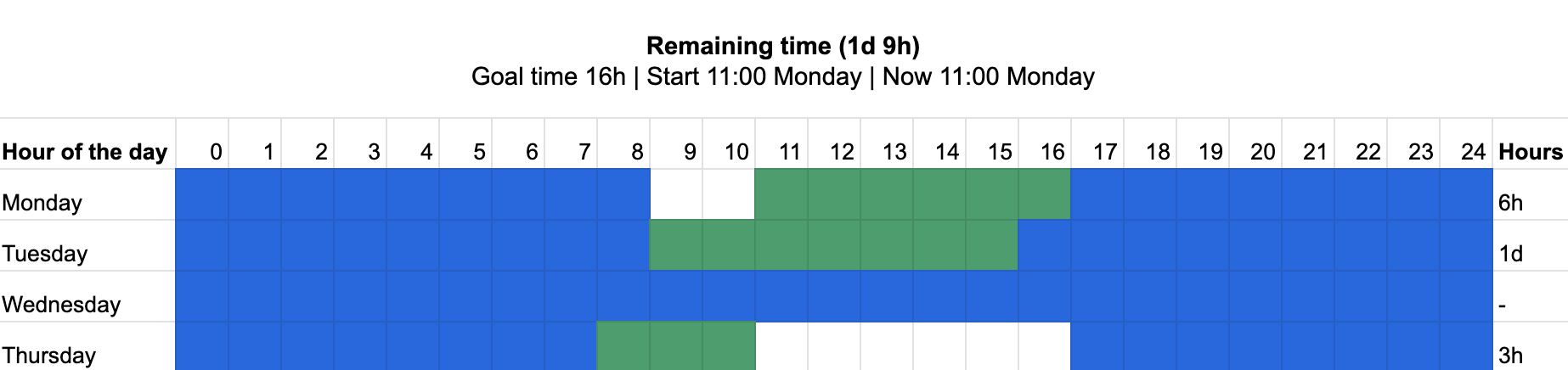 | 月曜日、11:00 | 月曜日の 11:00 ちょうどに時間のカウントが開始されました。残り時間の合計は 1 日と 9 時間で、内訳は次のとおりです。