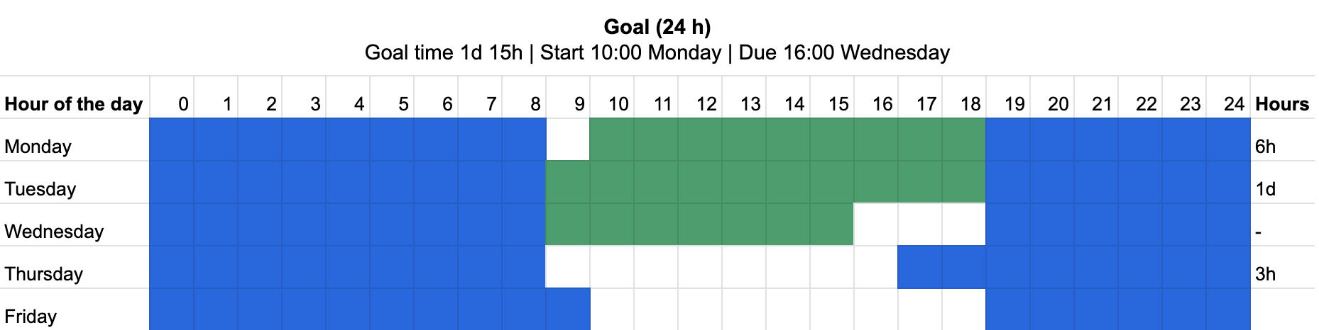 たとえば、リクエスト B の目標時間は 24 時間で、開始時間が月曜日の 10:00、次のダイアグラムに示す稼働時間を予定しているとします。目標は 1d 15h で、期限は水曜日の 16:00 です。